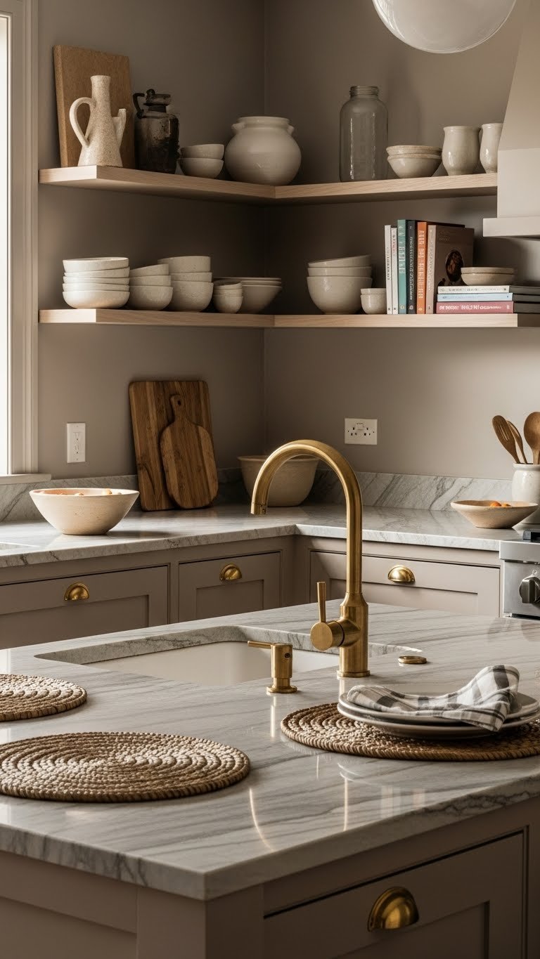 You’ll pair natural stone countertops with matte brass fixtures for subtle luxury, open shelving to breathe, and woven placemats to add texture. The result is a liberated, lived-in space that’s elegant without fuss, grounded and ready for daily life.