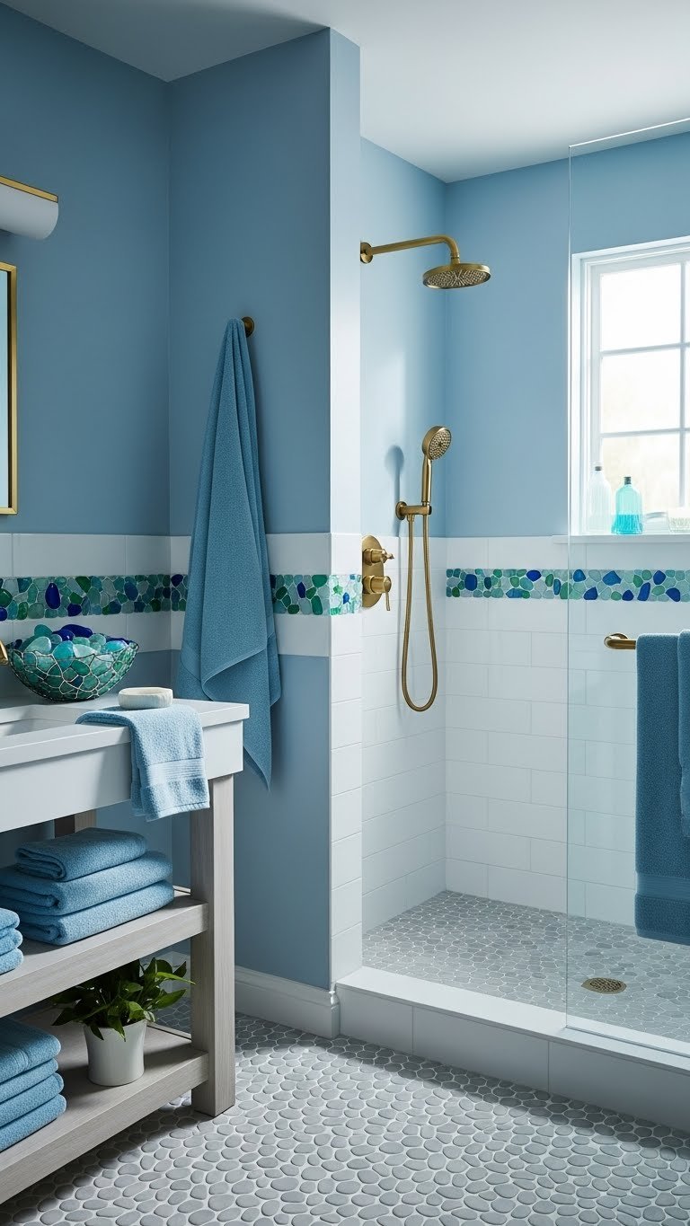 You’ll pair pebble tiles and sea glass accents with matte brass hardware, keeping surfaces minimal. Powder blue linens add layered softness while open shelving and natural light let you breathe and move freely.