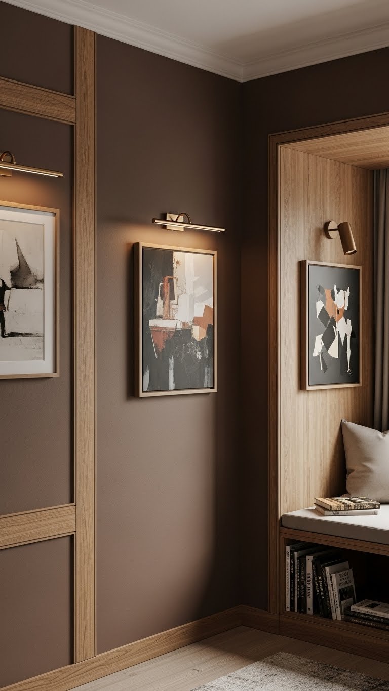 A mocha-mousse accent wall with wood trim gives a room warm depth and tactile contrast, letting rich chocolatey paint meet natural grain for a balanced, sophisticated look. You’ll pick a matte finish to reduce glare and emphasize texture, then frame artwork or shelving with narrow trim.