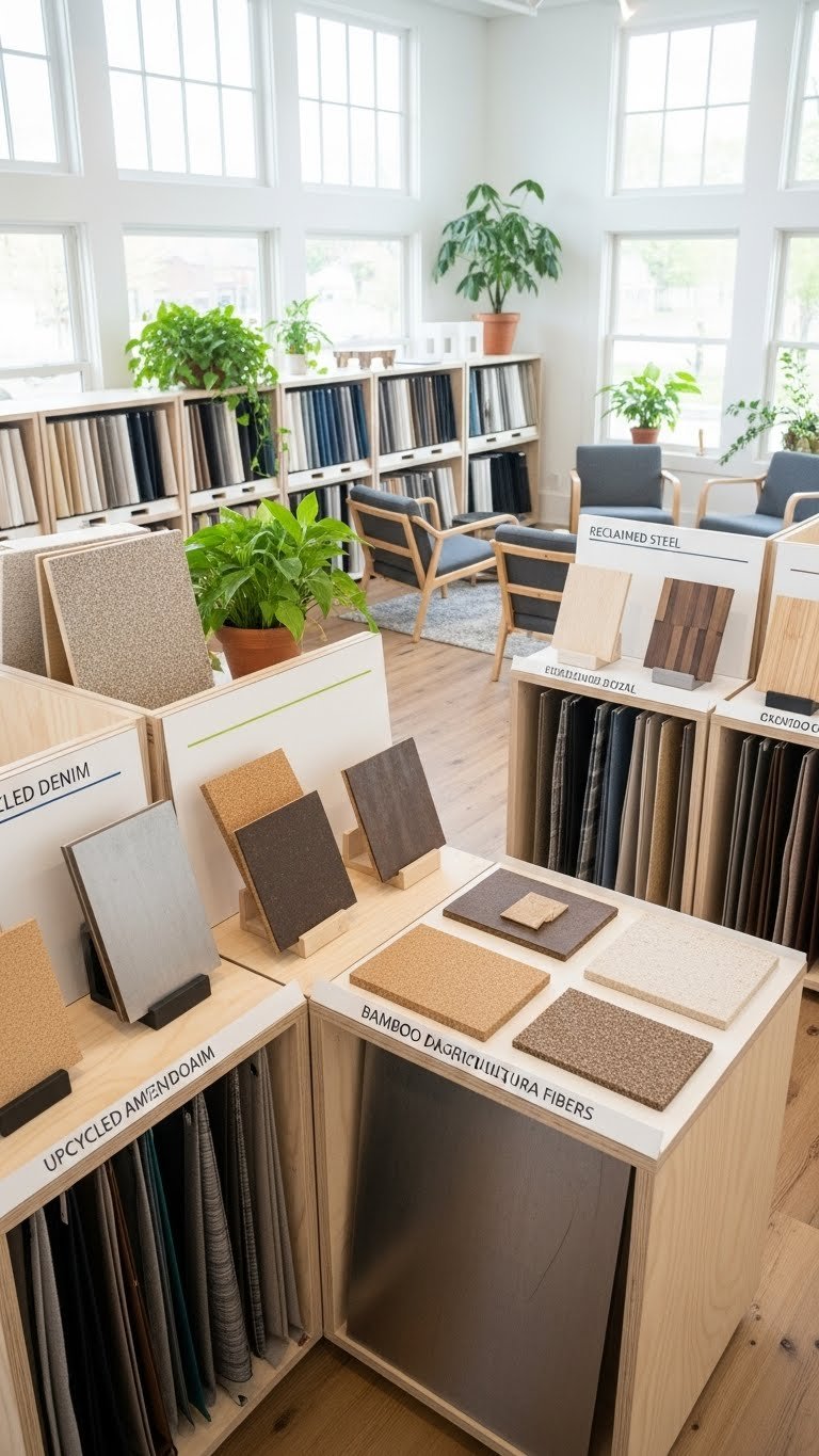 For a Sustainable Materials Showroom Corner, focus on curated samples and tactile displays that let you assess texture, weight, and finish up close. You’ll showcase upcycled fabric swatches, reclaimed metal accents, natural composites, and low-VOC sealants on open shelving.