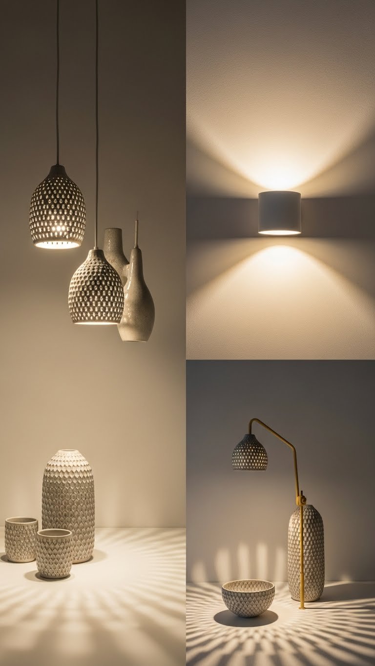 Against a backdrop of pale walls, textured ceramic lighting sculpts space with subtlety, casting soft, layered shadows that calm and define the room. You’ll choose pieces with glazed texture to reflect warmth and mattes to absorb light, creating intentional shadow play.