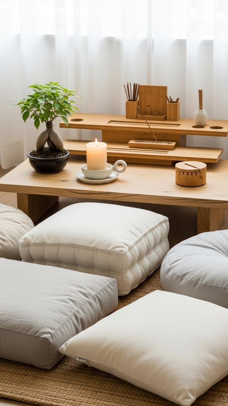 When you carve a small corner of your home into a Zen-inspired meditation nook, focus on low, tactile elements that invite stillness: a cluster of floor cushions in natural fabrics, a simple mat, and a low table or shelf for a candle and a small plant.