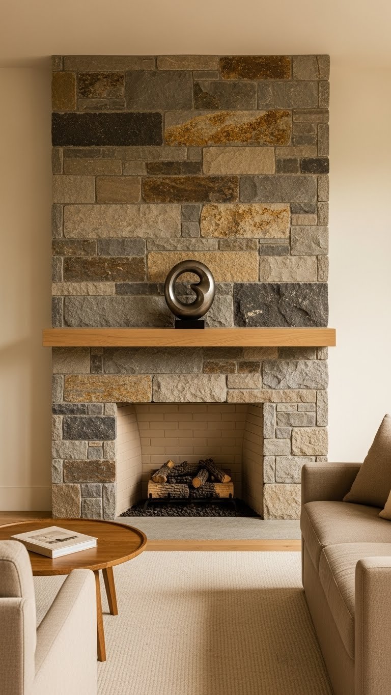 A natural stone fireplace anchors a room with quiet strength, and you can keep its presence simple by pairing the textured surround with a pared-back mantel and a restrained color palette.