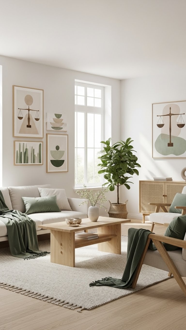 Embrace sage textiles for throws and cushions, pair muted walls with natural wood, and hang Balance artwork to create calm focal points. You’ll foster happiness and effortless equilibrium while keeping spaces open, airy, and true to your independent style.