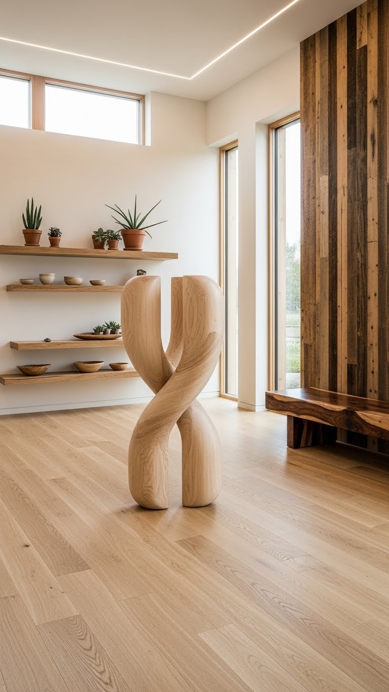 You’ll choose sustainable timber finishes, mix raw and polished grains, and place wooden sculptures as focal points. Let simple oak shelves, a reclaimed bench, or a sculpted piece invite calm, connection, and effortless freedom into your room.