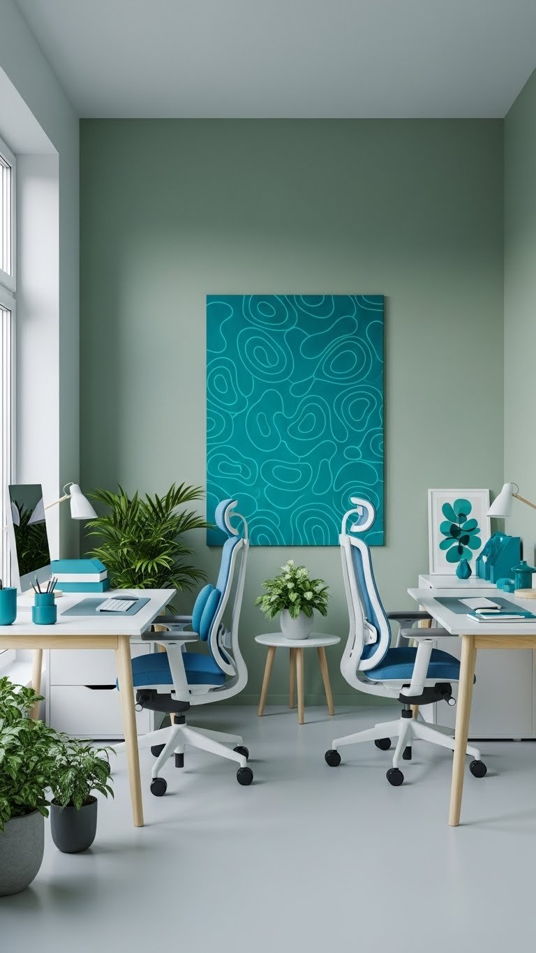 Choose ergonomic blues for chairs and accessories, pair muted sage with crisp teal accents, and cultivate a minimal layout that supports movement. Teal productivity pops in art or a single wall, freeing your mind to work.