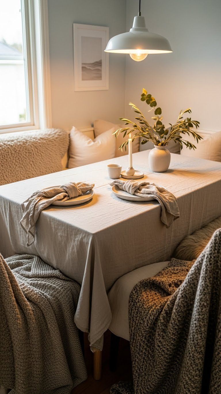 After the energy of sharp angles and bold prints, softer textures can ground your dining nook and nearby spaces—wrinkled linens bring that calming counterpoint. You’ll craft a wrinkled linen nook that invites lingering, pairing neutral tones with tactile throws and loose napkins.
