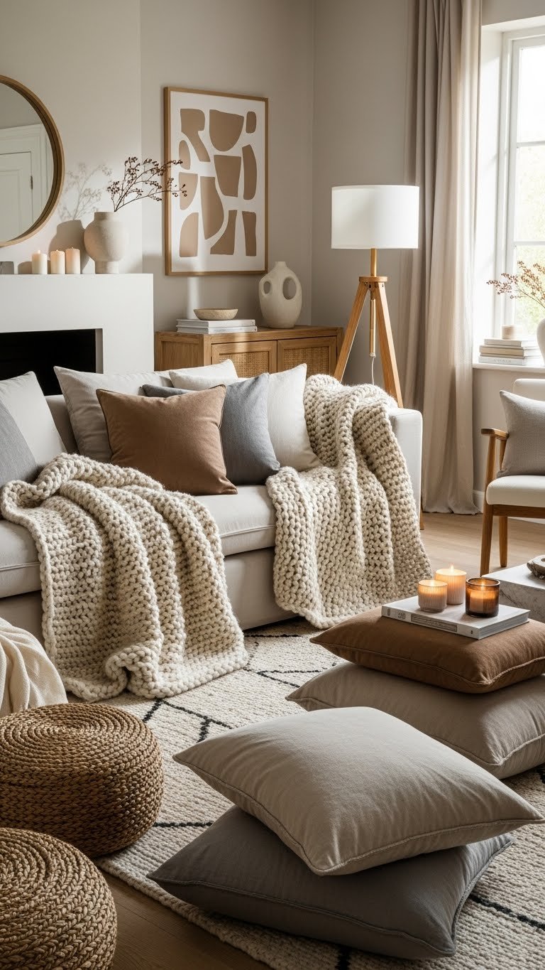 You’ve already set the stage with layered neutrals and tactile surfaces; now bring that softness closer by draping chunky knit throws over every seat.