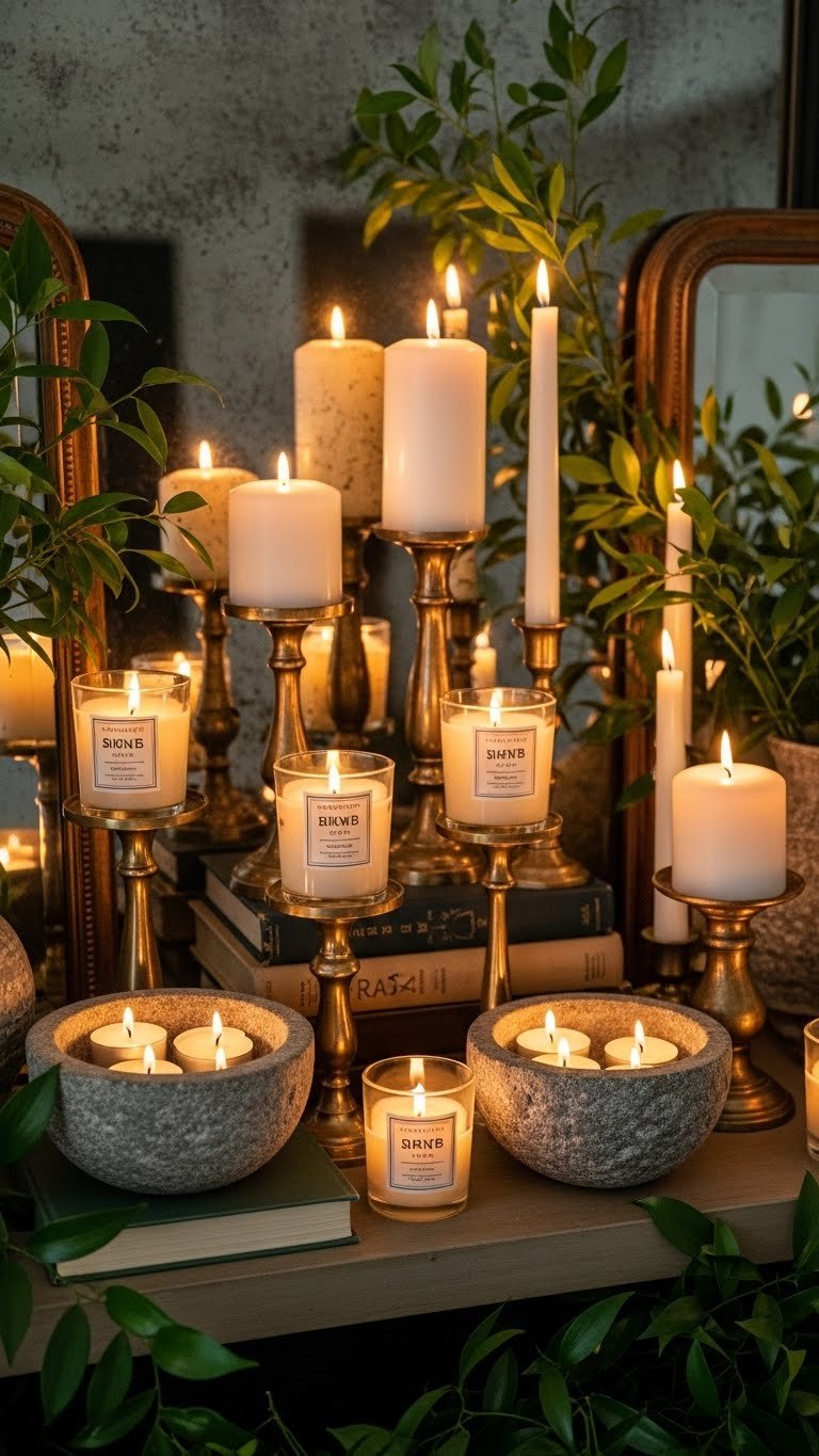 Mix heights—pillars, scented votives, tea lights—in brass holders and stone bowls. Add greenery and a few books for texture.