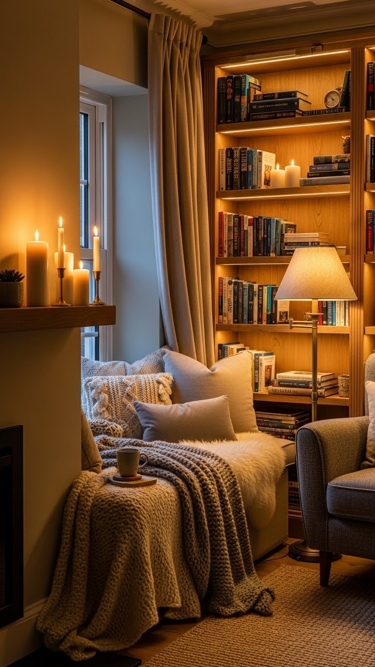 After arranging candles on the mantel, carry that same warm glow into a nearby corner to create a snug reading nook that invites you to linger.