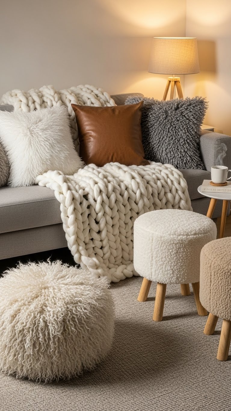 You’ll mix textures, draping a chunky throw over a sofa, pairing a vegan fur pouf with a neutral rug, or anchoring a cozy corner with faux shearling ottomans for effortless, free-spirited comfort.