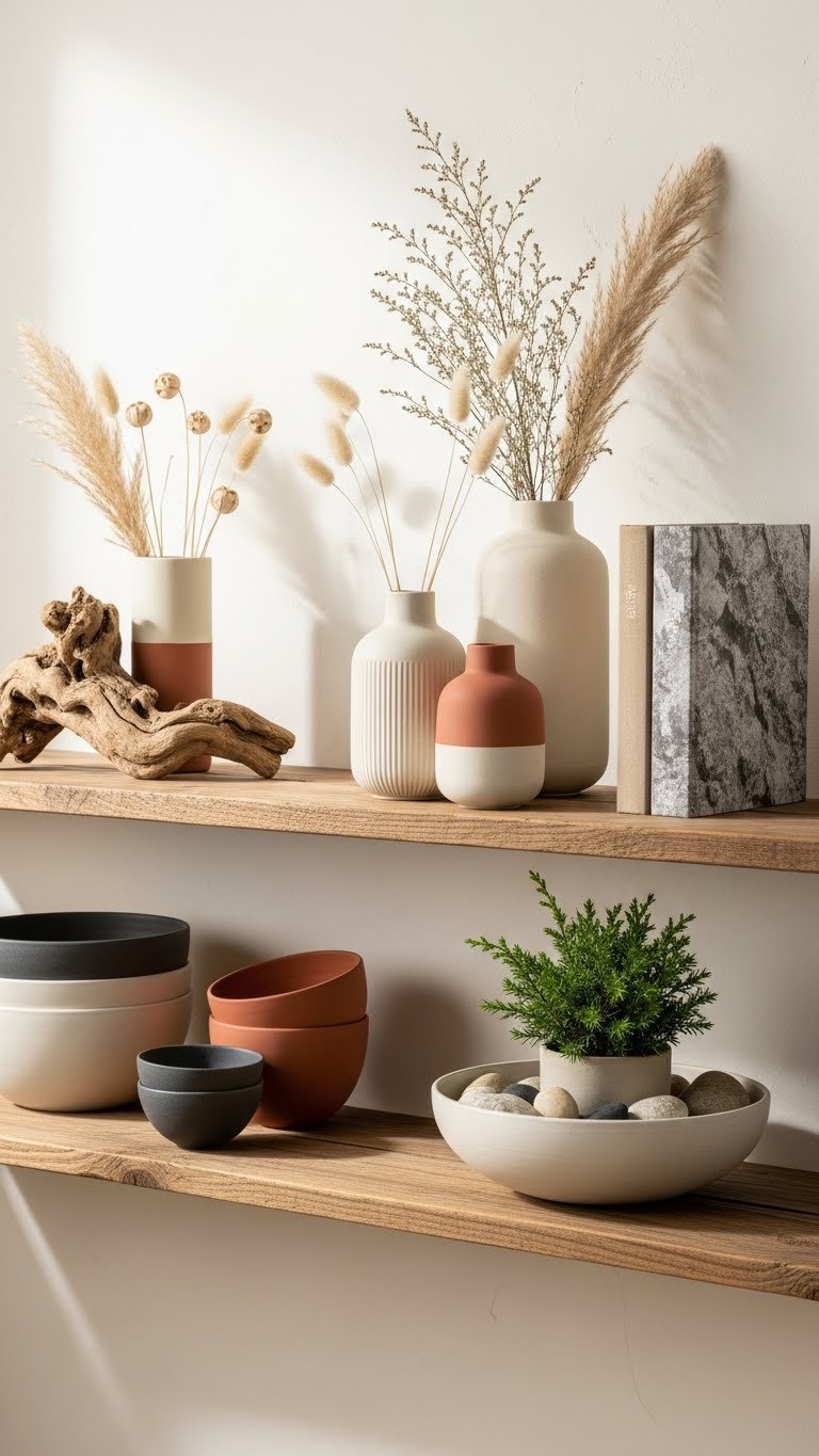 You’ll mix clay vases with dried grass, place driftwood sculptures beside seed pod arrangements, and leave breathing space for effortless, free living.