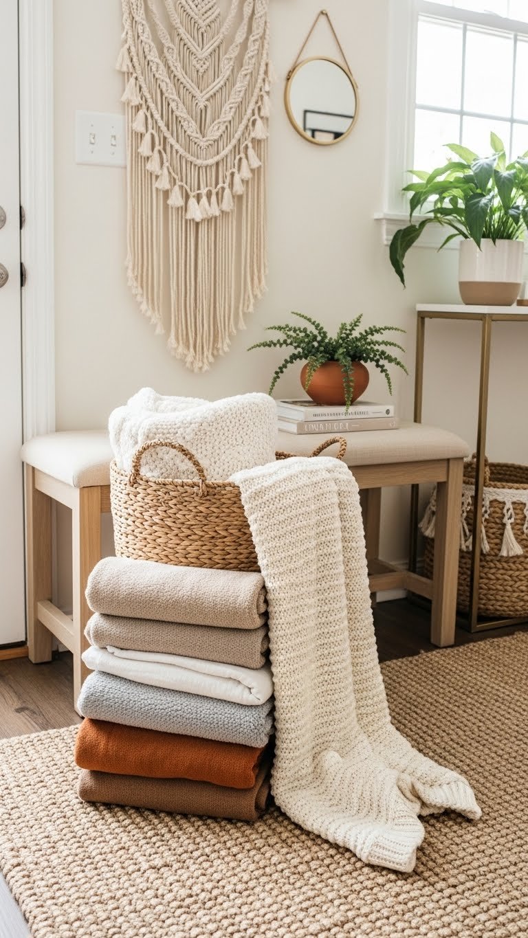 Tuck a woven basket by the door to keep extra blankets handy and welcome guests with a cozy, curated touch. You’ll place a mudroom basket near an entry bench, folding throws to show texture and color.