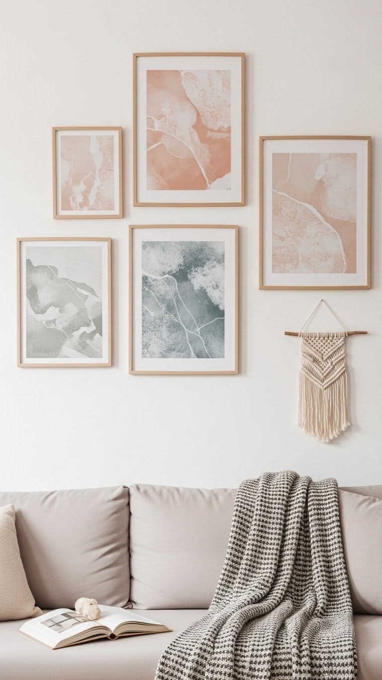 After you’ve got throws within easy reach, let your walls join the welcome by hanging soft, minimal art that gently warms blank spaces. Choose textured prints in muted palettes and airy frames so rooms breathe.