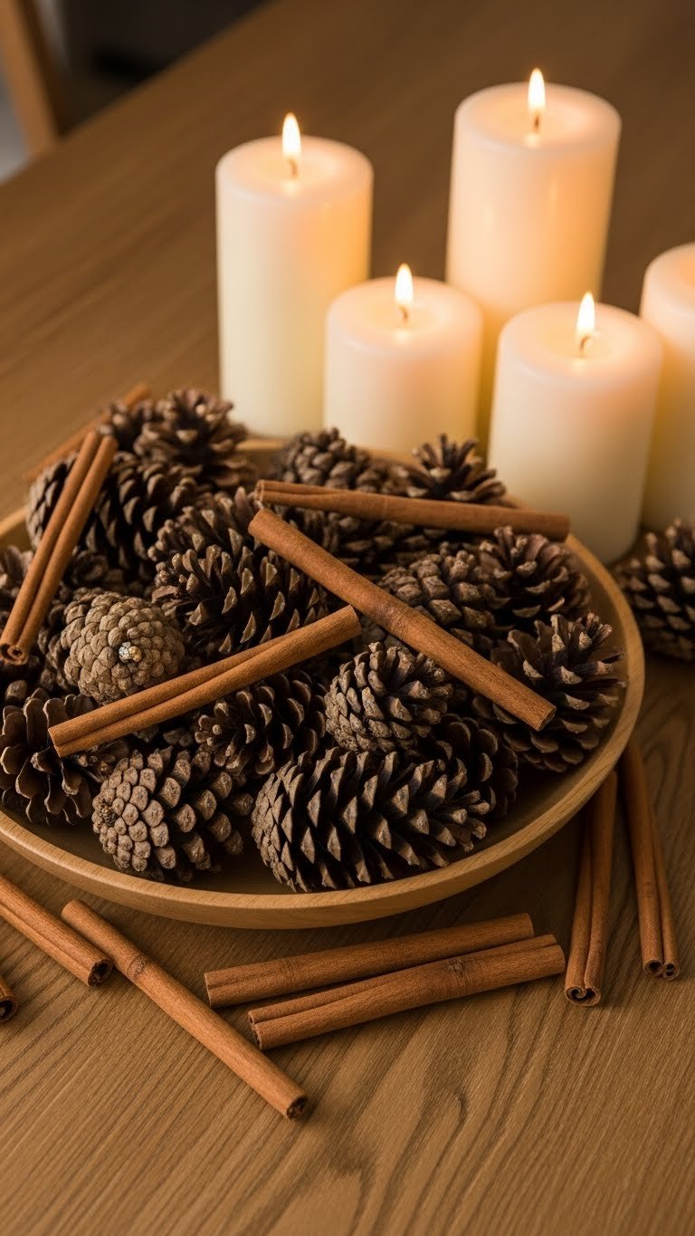You’ll arrange varied cones in a shallow wooden bowl, tuck cinnamon sprigs between them, and add a few unscented candles.