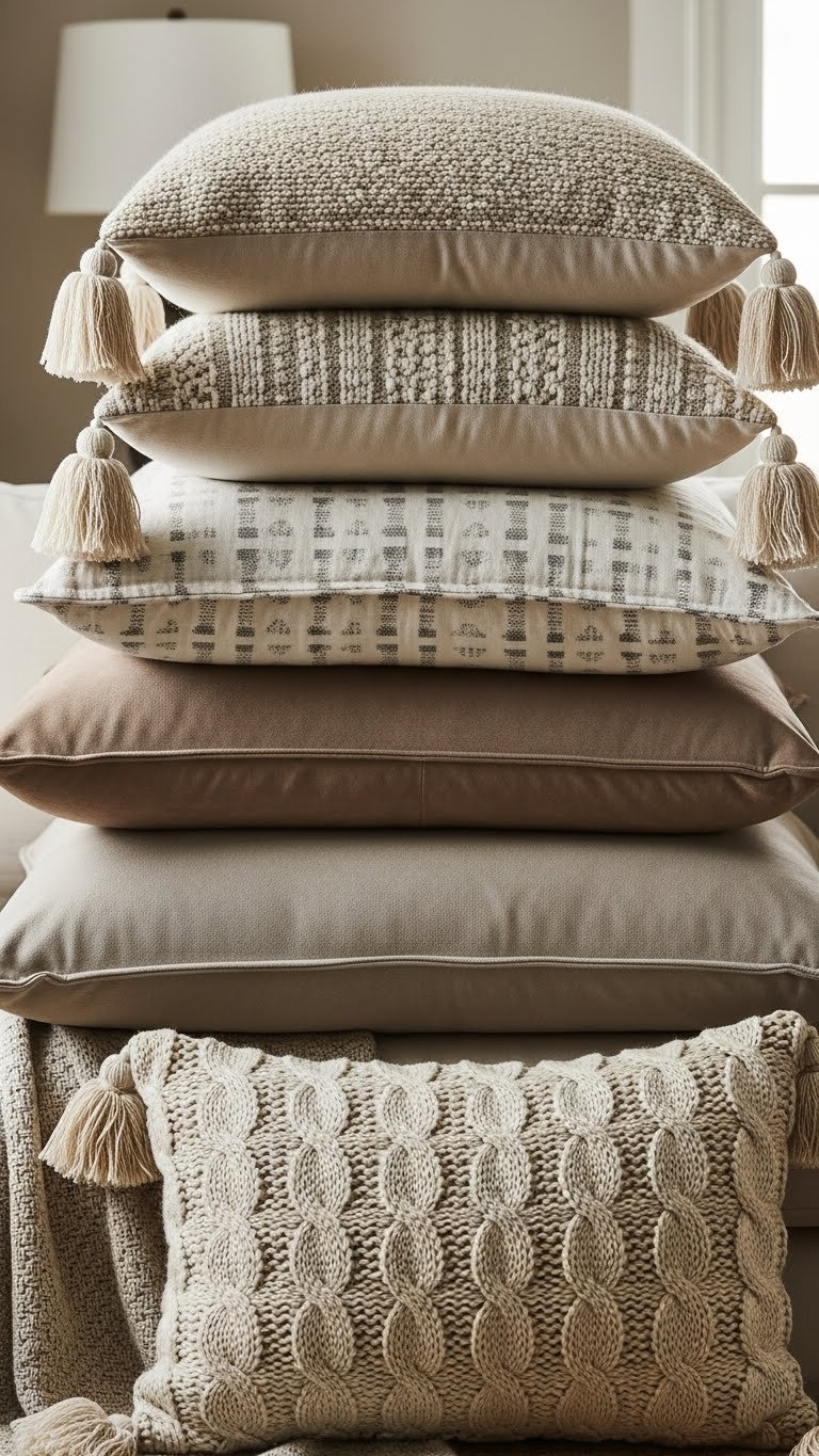 Layer neutral tassels and subtle pattern, mix suede bolsters with oversized square cushions, and stagger heights for cozy depth.