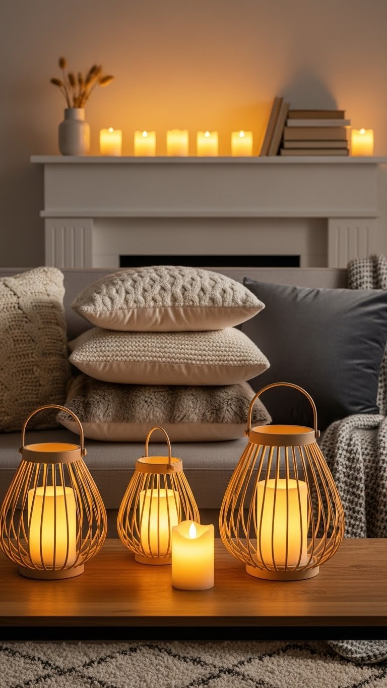 After you’ve layered those tactile pillows to invite slow mornings, bring the same cozy mood to your lighting by swapping open flames for LED lanterns and electric candles.