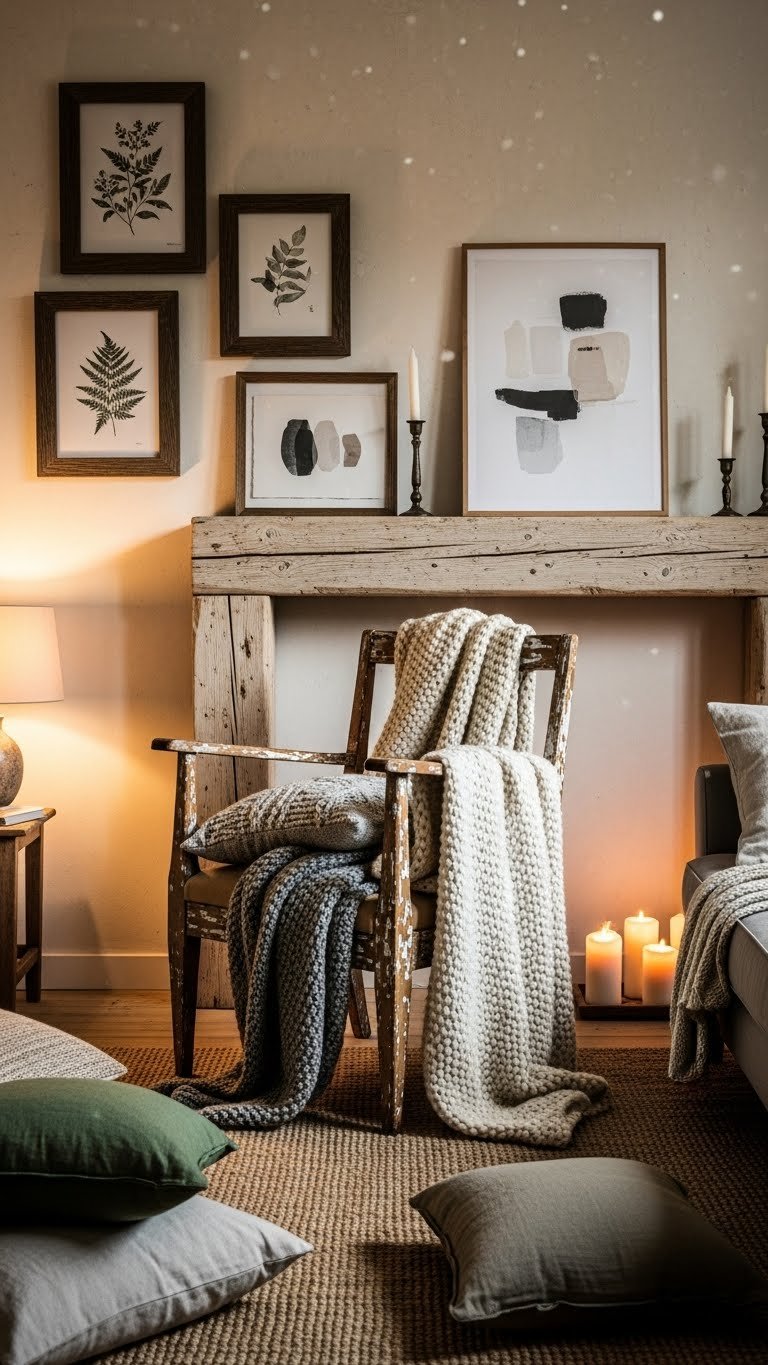 You’ll mix weathered frames with simple prints, lean a reclaimed mantel against a wall, and balance rough textures with soft throws.