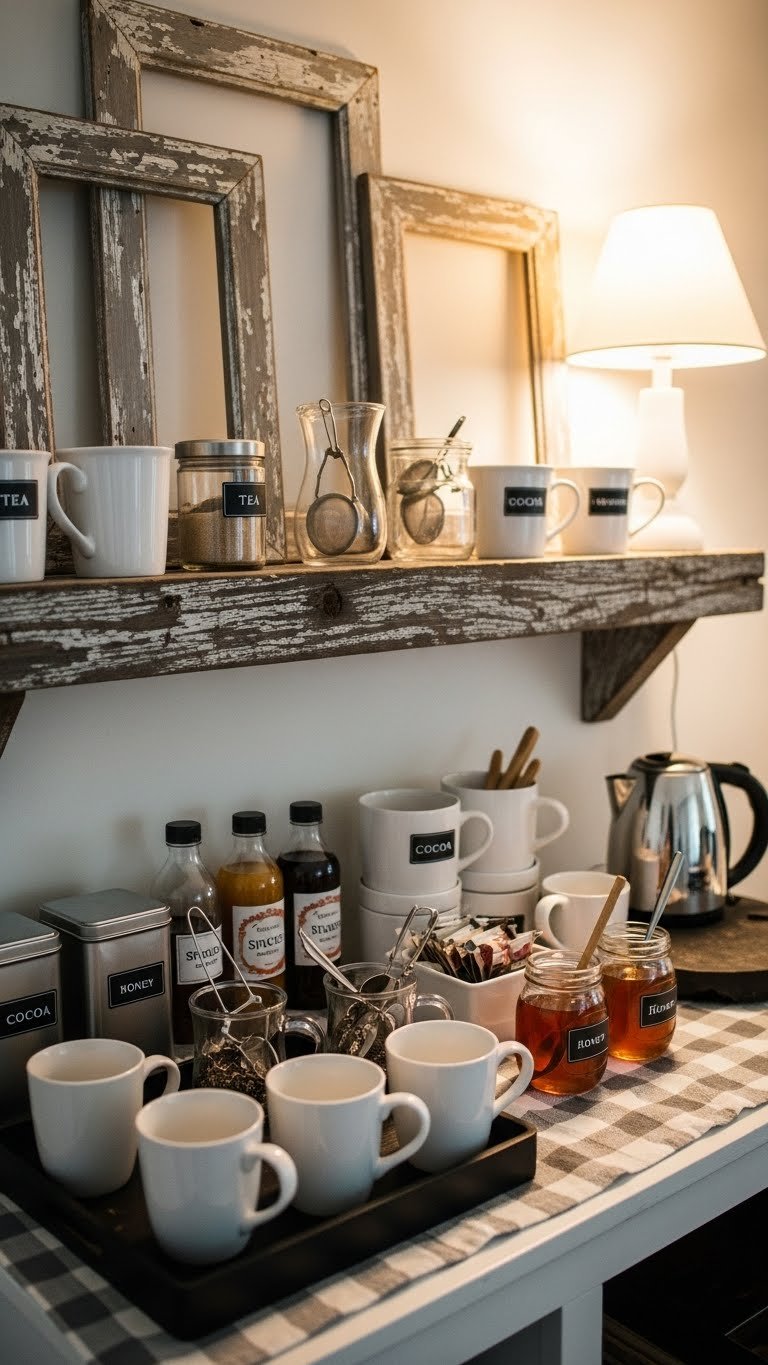 Once your room feels grounded by weathered frames and a reclaimed mantel, bring the hygge ritual to life with a dedicated tea and cocoa station that invites slow evenings.