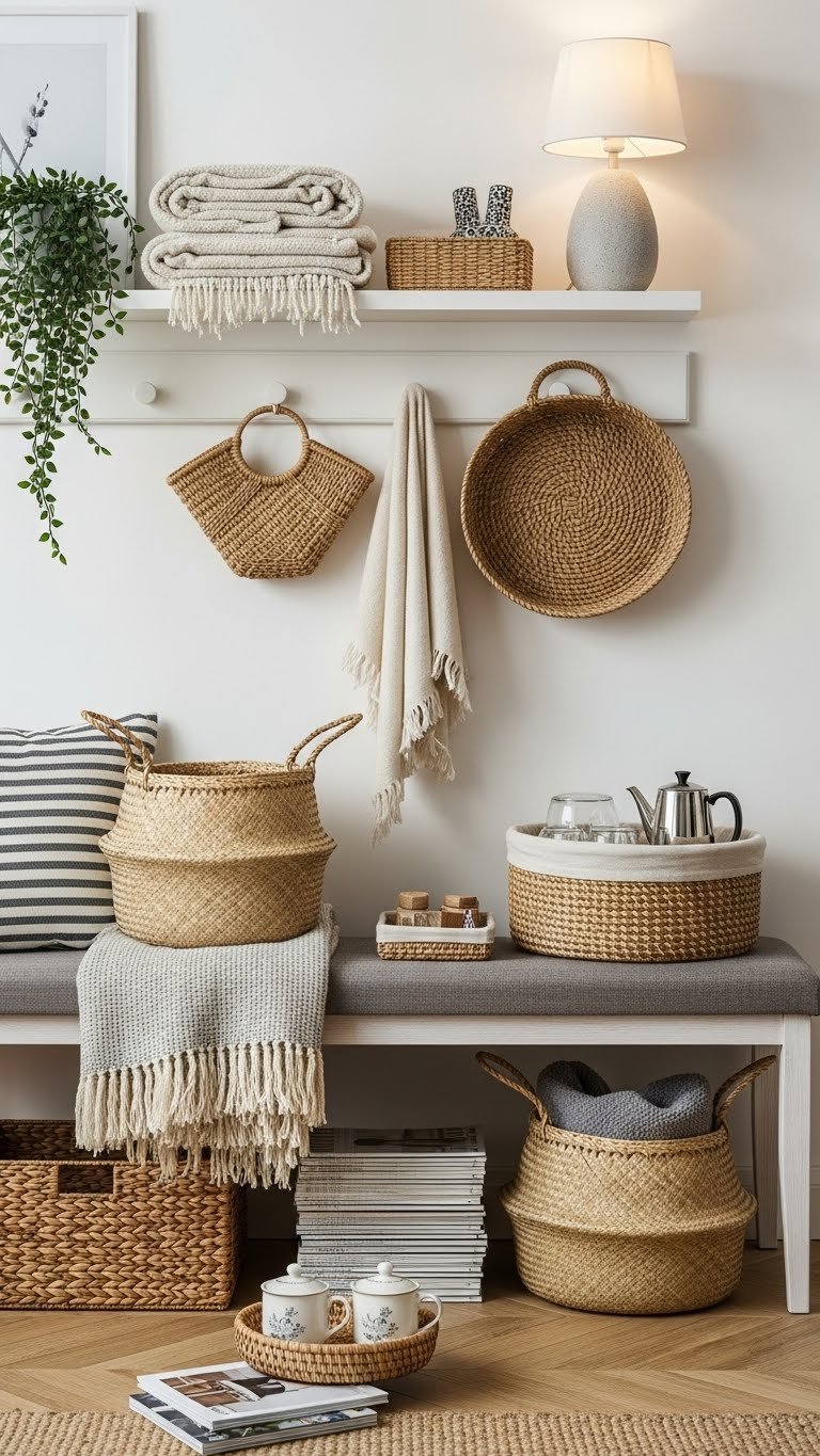 Woven-basket arrangements bring texture and function into your hygge scheme, letting you tuck throws, magazines, and extra tea supplies out of sight while keeping them within easy reach.
