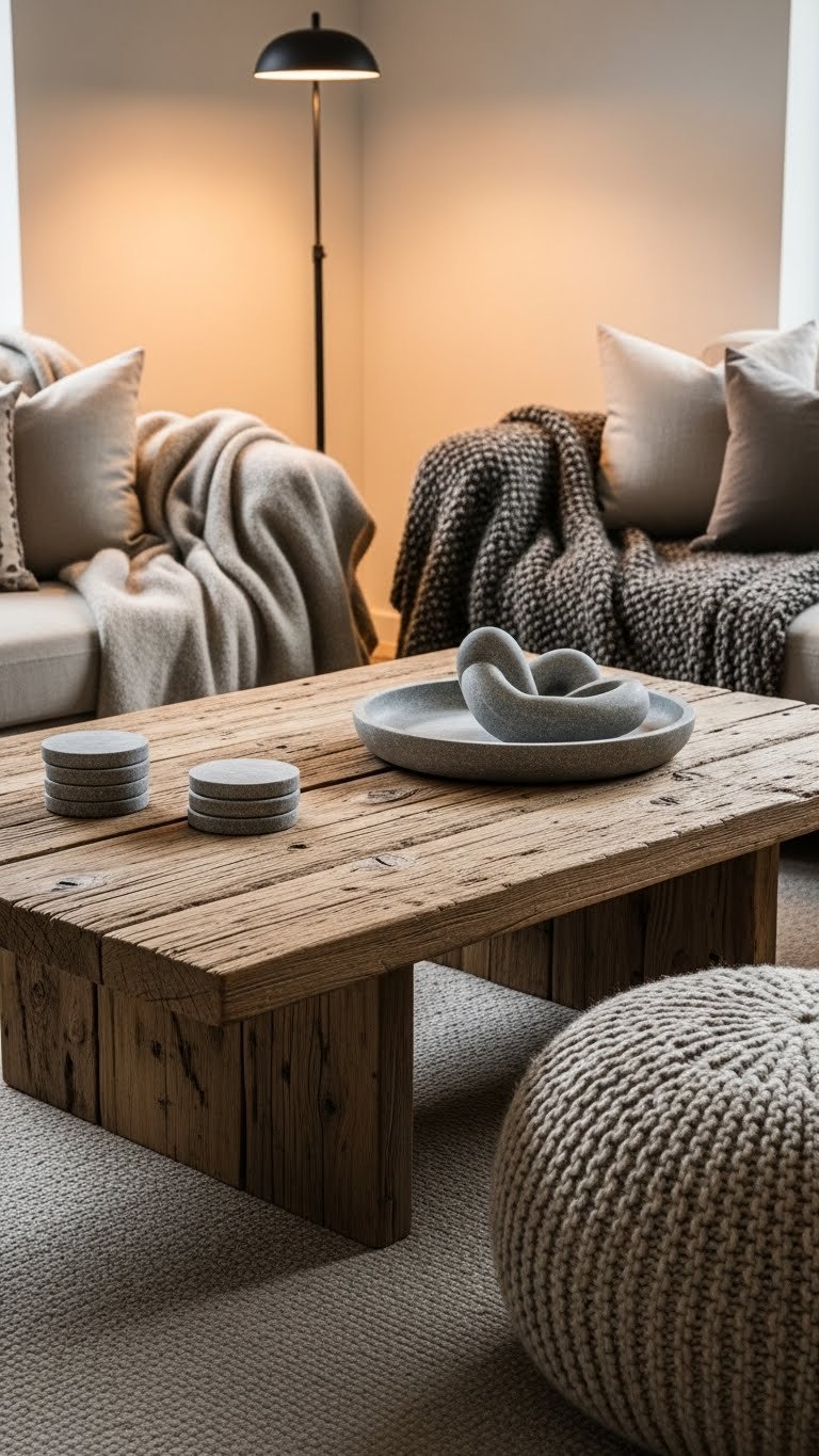 You’ll add stone coasters on a reclaimed wood table, a sculptural tray, and a neutral wool pouf for seating that invites stretching out.