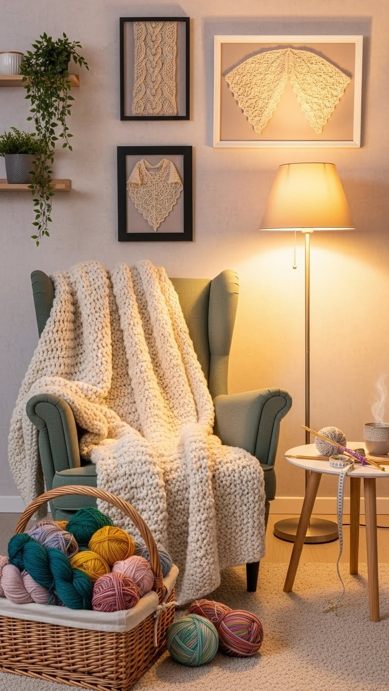 Arrange a comfy chair, a basket for yarn sorting, good light, and a small table for needles and tools.