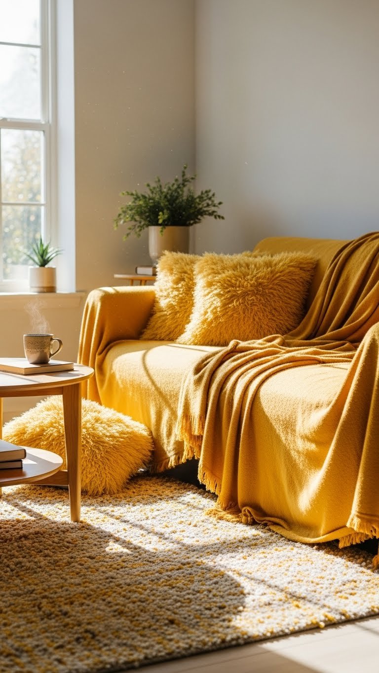 Brighten up January by layering buttery yellow textiles that instantly lift a room without overpowering it; think throw blankets, plush pillows, and a textured area rug in warm, soft hues. You’ll use butter yellow as a neutral-loving accent, mix cozy layers with textured throws and soft plaids, and let sunlight amplify warmth.