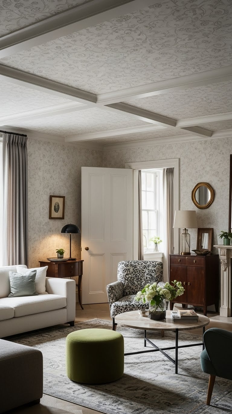 You can choose a patterned ceiling to amplify character, pairing modern prints with vintage stencils for a liberated, collected look.