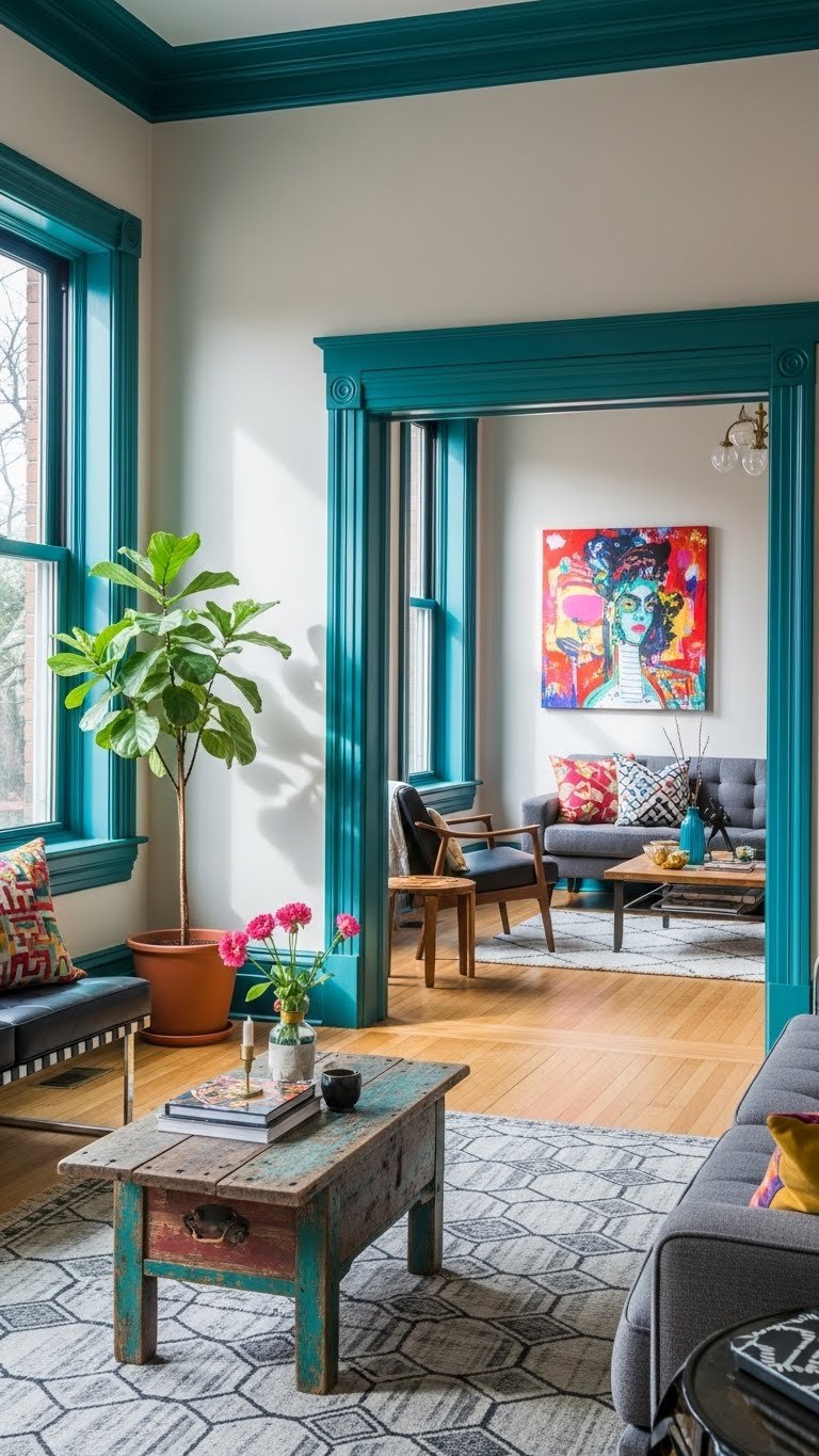 Choose bold trim to frame windows, doors, and baseboards, creating dramatic contrast that anchors modern or eclectic schemes. You’ll refresh the space quickly, show personality, and enjoy a liberated, stylish start to the year.