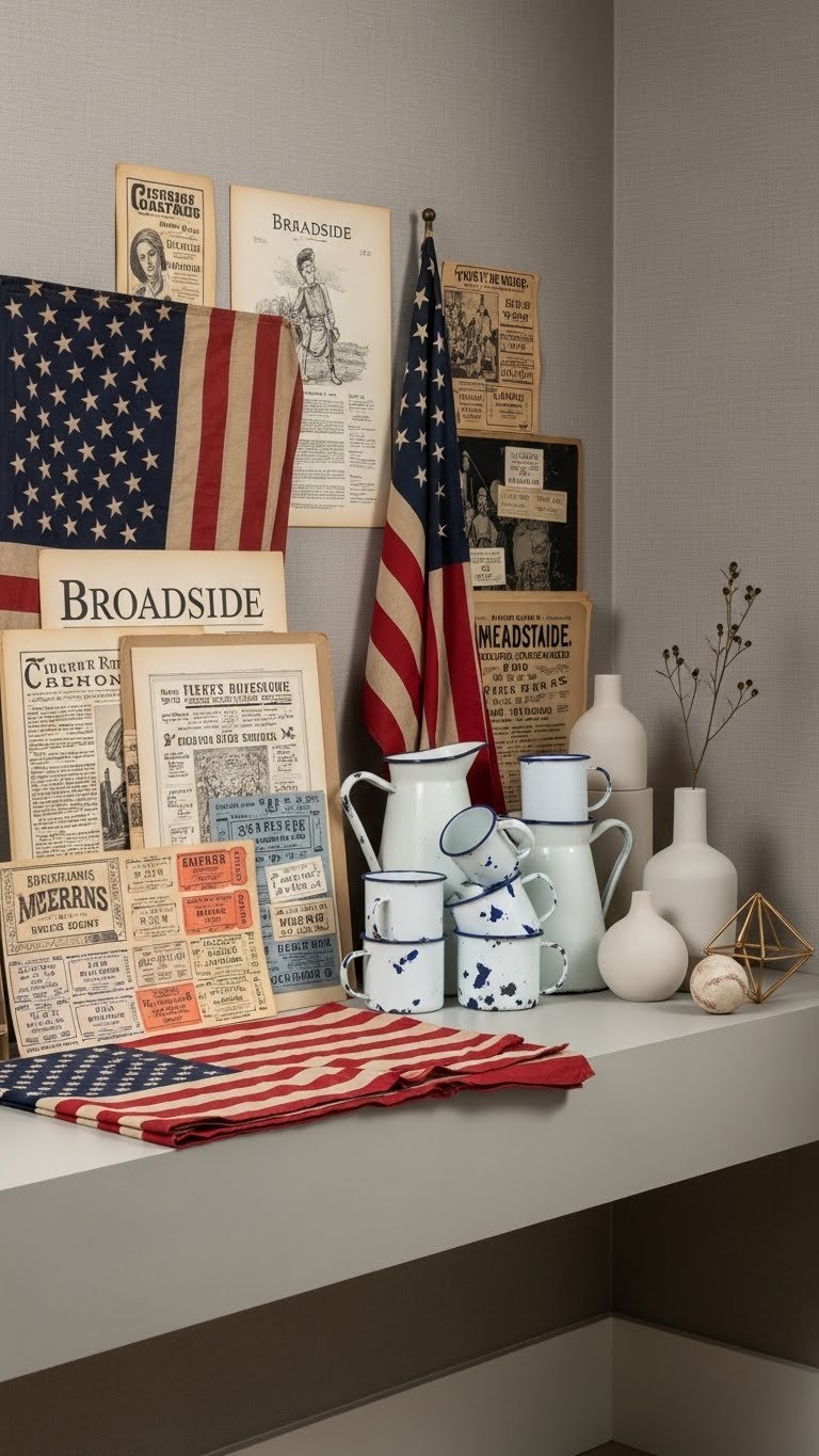 You’ll mix patriotic ephemera—faded flags, broadsides, ticket stubs—with modern neutrals, anchoring pieces on a floating shelf.