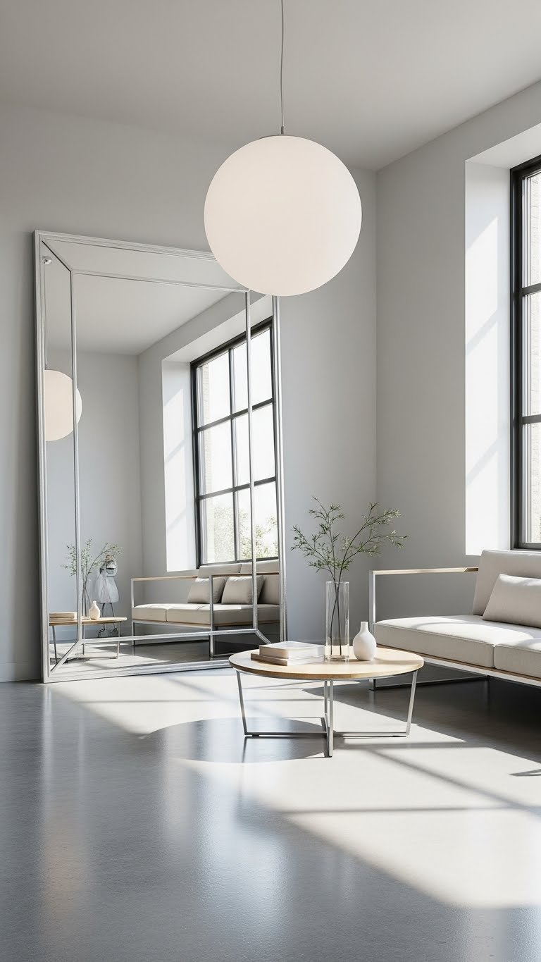 After you’ve set the mood with an oversize pendant, add a large decorative mirror to amplify light and visually double your space. Position it opposite windows or art to create a reflective focal point that lifts energy and depth.