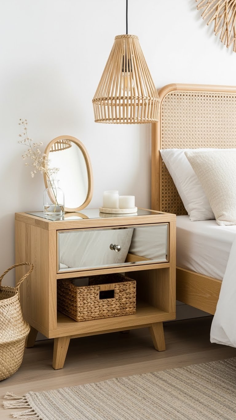 Introduce woven cane or rattan accents to instantly warm a January scheme with natural texture and airy silhouettes. You’ll layer these pieces—mirrored bedside heads, slim chair backs, basket planters—to add softness without clutter.