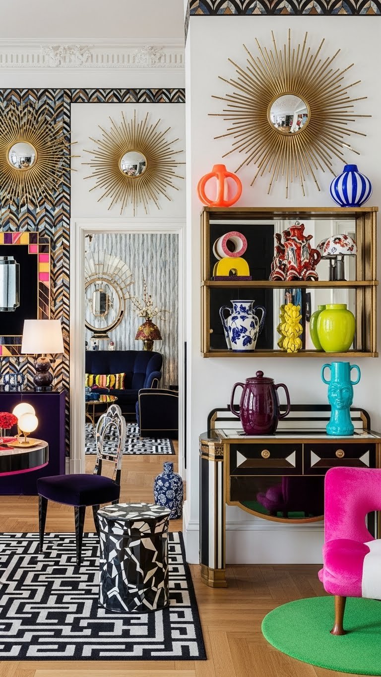 If you want a standout January refresh, blend Art Deco’s geometric glamour with Postmodern whimsy to create a layered, unexpected look. Mix mirrored sunbursts, bold inlays, and sculptural ceramics with playful shapes and lacquered pops. You’ll tap geometric glamour and neon nostalgia while keeping spaces open and liberated.