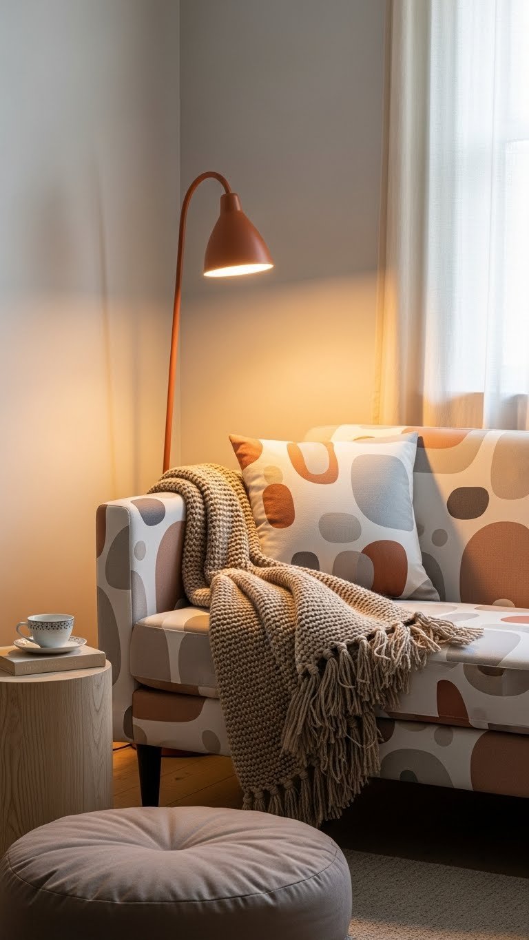 Pair a patterned armchair or sofa with a sculptural reading lamp, a textured throw blanket, and a low floor cushion for lounging.