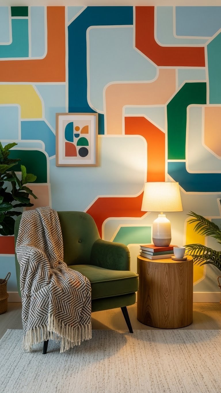 Choose a hand painted mural or a bold geometric fresco to inject personality and motion. You’ll control scale, palette, and mood—opt for airy tones or saturated accents that free the space while anchoring furniture and art.