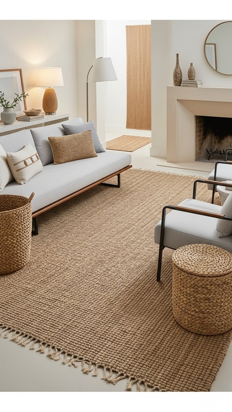 Choose jute runners for narrow corridors and layered seagrass textures in living areas to add organic depth.