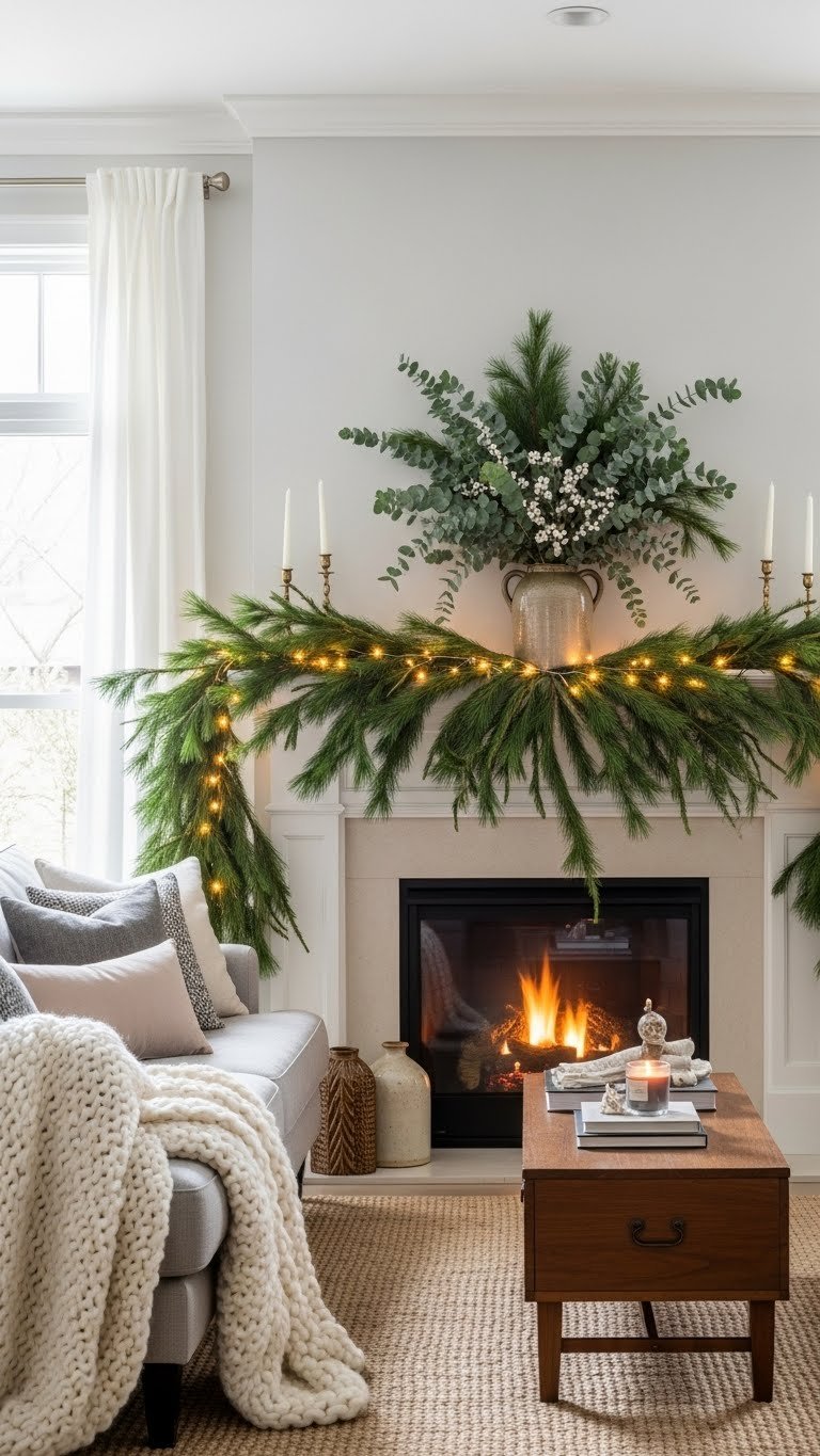 Choose winter eucalyptus stems in vases for soft fragrance and sculptural form, and drape pine swags over mantels or mirrors for crisp texture. You’ll create a calm, liberated vibe that’s low-effort, on-trend, and easy to refresh as the season progresses.