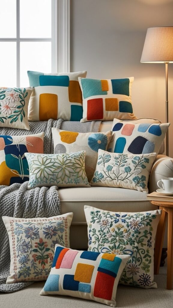 Shake up your living room by swapping flat, neutral cushions for embroidered throw pillows that bring instant texture and personality. You’ll choose hand stitched details and color blocked designs to make bold, carefree statements.