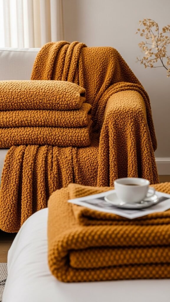 Layered over a sofa or folded at the end of a bed, ochre bouclé throws add depth and warmth with tactile charm. You’ll use bouclé layering to create cozy zones and subtle ochre contrast against neutrals, inviting you to relax or entertain.