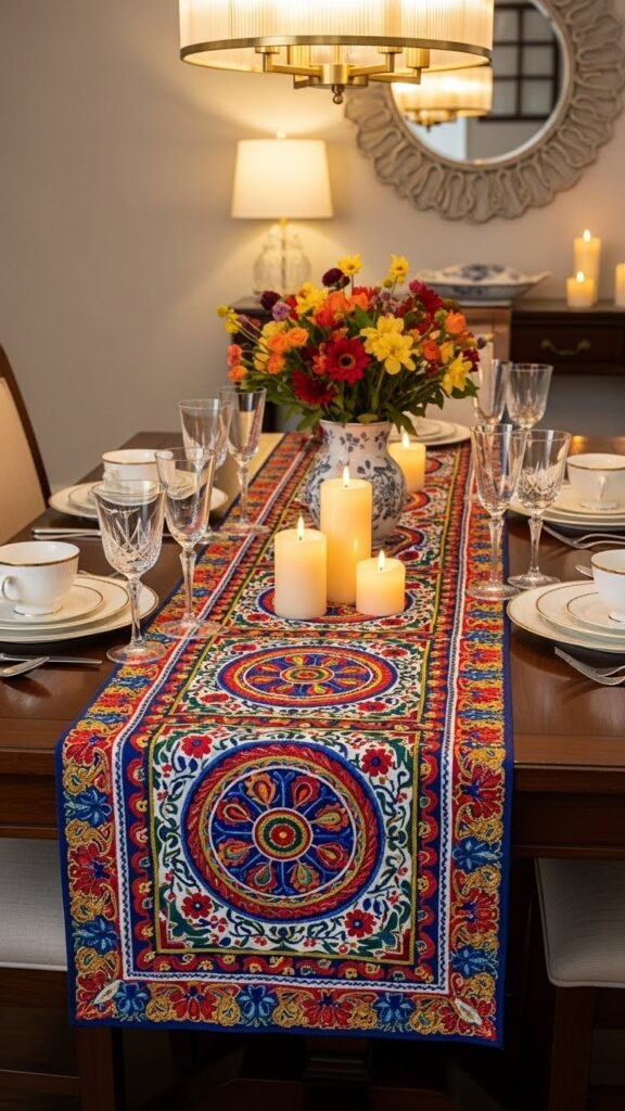 Bring a shot of global pattern into your table setting with a Suzani-inspired runner that anchors the room and sparks conversation. You’ll layer rich Suzani motifs onto crisp Table textiles to create effortless warmth.