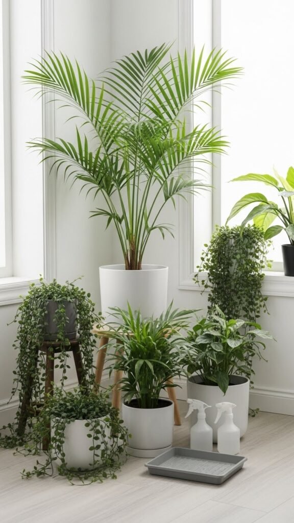 You’ll place a potted palm in a corner, use floor grouping for impact, consider light placement for growth, and practice humidity care with trays or misting.
