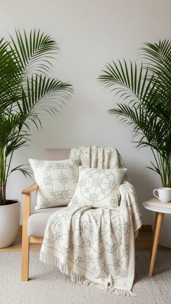 Just as potted palms bring texture and life to a corner, hand-sewn French knots add small, tactile accents that lift a room’s soft furnishings. You can stitch subtle patterns on pillows and throws, pairing hand stitched florals with minimalist linen for a liberated, calm vibe.