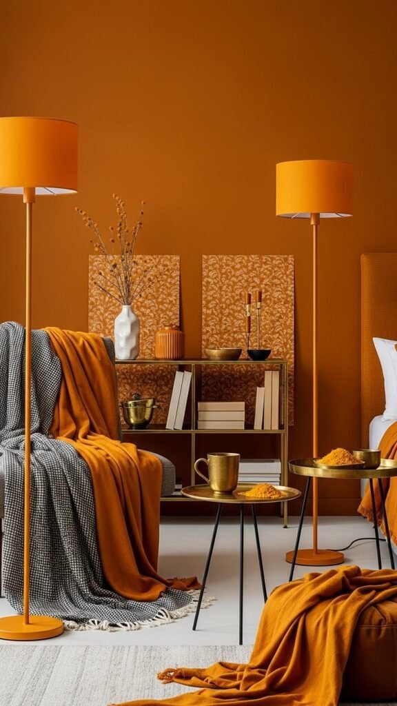 You’ll mix saffron lampstands with textured throws and brass accents to spark joy and wanderlust.