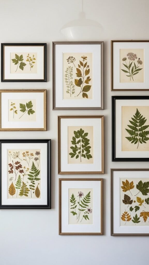 Arrange framed herbariums and pressed leaf collages in varied frame sizes, keeping spacing consistent. Mix vintage and modern pieces, lean into airy mats, and choose a restrained palette. You’ll free your space while showcasing personal, natural touches that breathe.