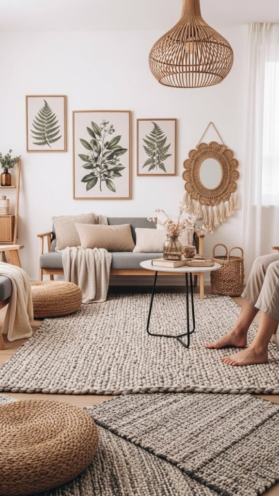 If your botanical gallery brings a soft, organic vibe to the walls, ground the room with a chunky knit-like woven rug that echoes that tactile, natural feel underfoot.