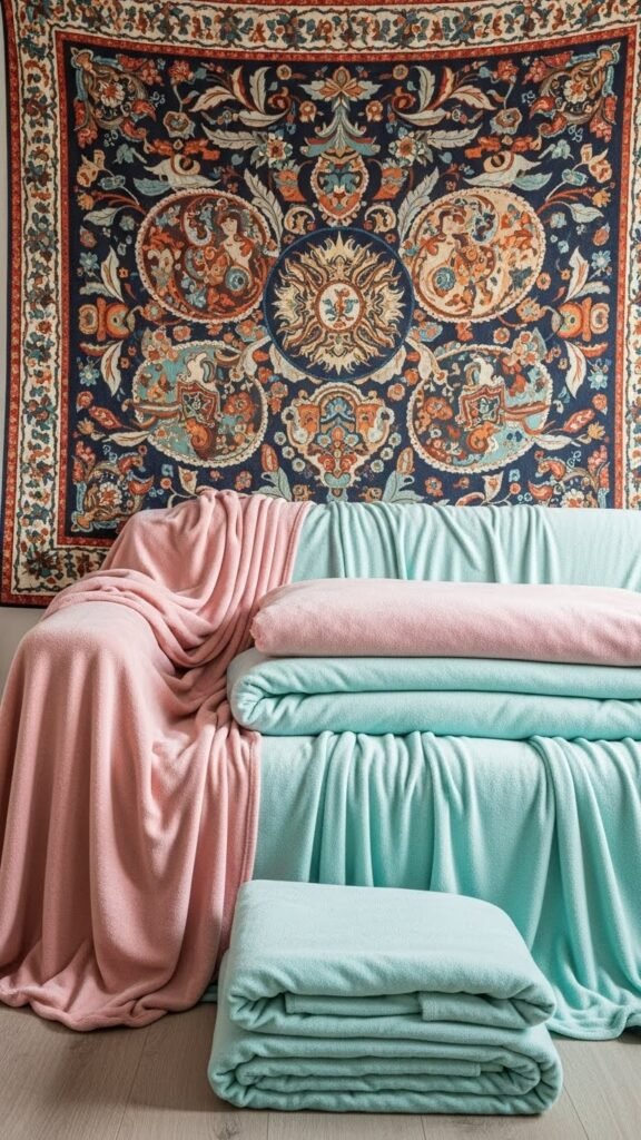 After a bold tapestry sets the room’s mood, soften the seating area by layering pastel blush and mint throw blankets to add depth and comfort. You’ll create effortless pastel layering that feels breezy and personal—drape one blush throw, fold a mint blanket at the foot, and mix textures for coziness.