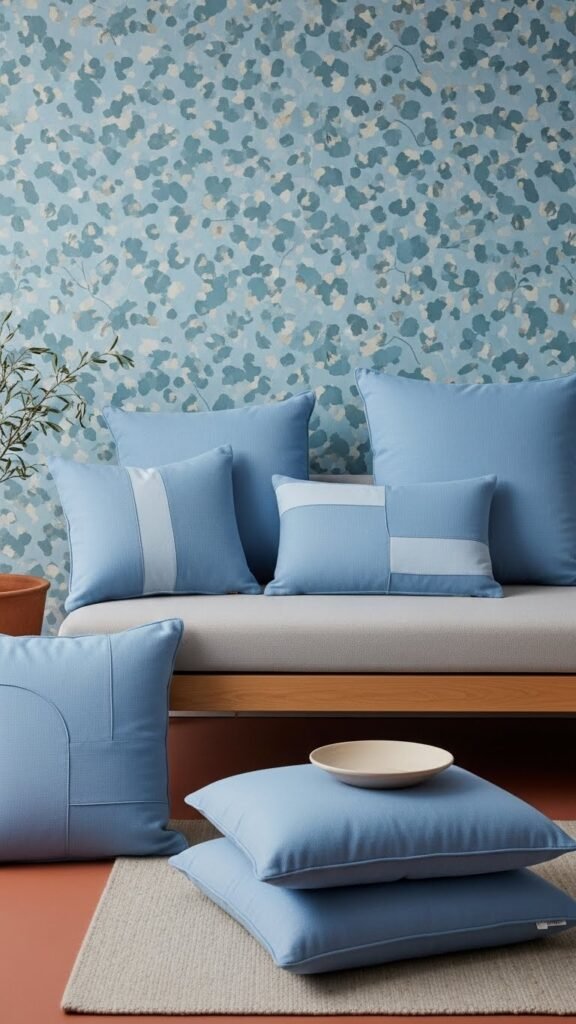 A few powder blue cushions will lift the room’s warmth without competing with your Harlequin Fayola wall—think soft vibrancy that cools and balances the terracotta tones. You’ll choose minimalist shapes and breathable fabrics, arranging cushions for effortless cushion styling on sofas or floor nooks.