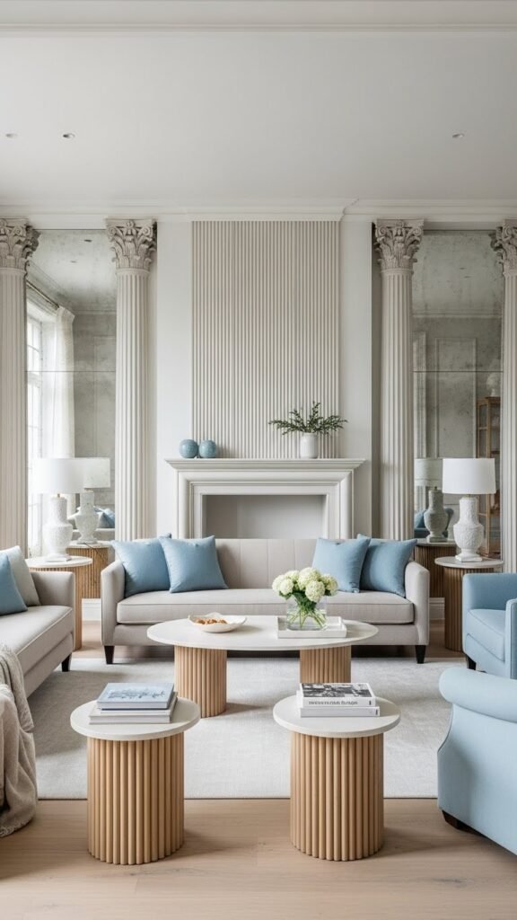 Let the cool ease of powder blue cushions meet a few Neoclassical pieces with fluting details to anchor the room with quiet structure. You’ll add fluted mantelpieces for subtle rhythm and columned mirrors to lift light, creating open, guided sightlines.