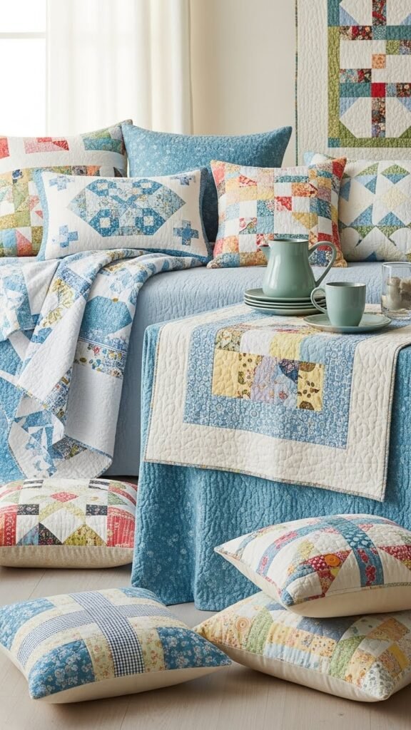Choose a quilted patchwork in airy colors, pair with solid linens, and echo motifs with patterned sashing on cushions or table runners.