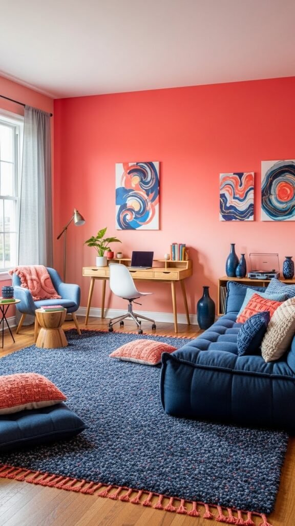 When you pair dark coral with denim blue, you get a lively yet grounded palette that makes accent rooms feel both invigorating and cozy.